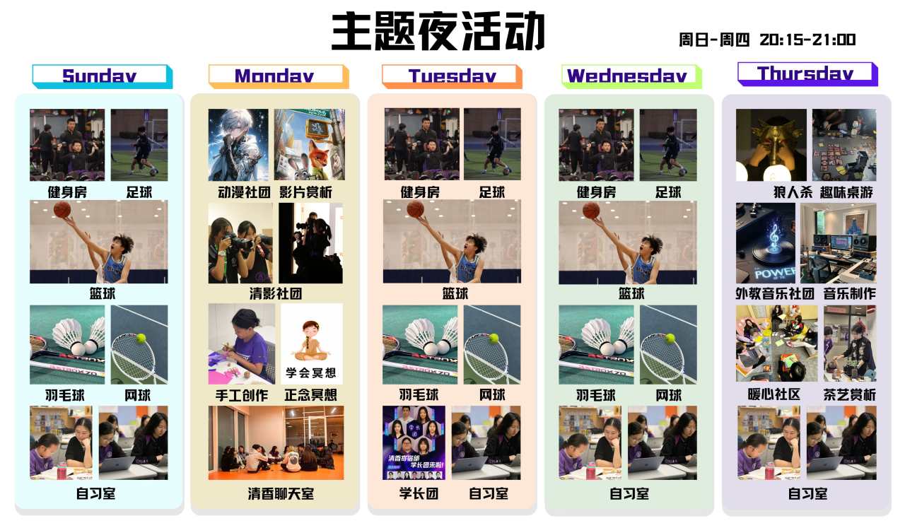 清香寄宿中心所在的“明斋”是绿色环保建筑,通过了美国绿色建筑委员会的权威认证并获得 LEED 金奖,建筑采用地 源热泵采暖制冷,新风系统、中央空调一应俱全。此外,全楼还配有空气质量检测系统,当室内空气出现变化时,检测 系统会发出报警提醒,以便调试,确保孩子们呼吸到新鲜空气,保障身体健康。所有房间配备了齐全的学习、生活设施, 以及环保舒适的床上用品。 每个房间都是独立卫浴,且干湿分离,极具人性化。每个楼层还免费提供洗衣设备(洗衣机和烘干机),每个楼层也都 设有专门的学生自习室和直饮水系统。宿舍楼下设有静音舱电话亭,便于孩子们及时跟家长联系沟通,宿舍楼每层男生 区和女生区也都配有专门的电话和对讲机,保障寄宿生在遇到特殊情况时也能随时联系到老师和家长。 除了一流的硬件设施,“专业的支持与服务”也是清香寄宿中心的特色。“双导师制”,各尽其责,全方位引领,助力 学生健康发展。每个孩子都有一位学术导师和一位成长导师,以确保来自多元背景的每个孩子在学业和生活方面都被全 方位关爱,每个孩子的特殊优势都能得到关注。 学校还在宿舍楼健康中心设置了专业的校医室,提供 24 小时的医疗服务,为孩子们的健康提供了另一层保护。营养均衡, 品种多样的一日三餐,以及上下午大课间和晚自习后三次的美味加餐,为孩子们的能量摄取提供了保障。 清香寄宿中心还为孩子们提供提高学术英语水平的英语晚课。英语晚课包括学术英语课程和出国考试课程供学生选择。 清香大讲堂的大师讲座也是清香寄宿中心的特色。每周返校日,我们邀请在专业领域有卓越建树的科研人员或专家教授 等专业人士为孩子们开启一场又一场别开生面的大师讲座。 清香寄宿中心开展了丰富的课余活动。“绘筑清香园”的年度画展和摄影展活动,培养了孩子们对美的欣赏和追求,以 及对生活的热爱。“主题夜活动”,涉及英语学习、纪录片赏析、体育运动和影音、手工、拼图、心理、桌游、音乐制 作等丰富的选择。活动形式多样而有趣,孩子们可以根据个人兴趣和需求自主选择。“温暖生日派对”,每月初清香寄 宿中心的导师们都会为当月过生日的孩子精心策划一次生日派对。 清香寄宿中心还设置了一系列的评比及奖励机制。比如,优秀宿舍评比、全勤奖、先进个人奖等。 清香寄宿中心重视家校协同共促学生成长。每个宿舍都有自己的专属微信群,群内有主管校领导、寄宿部主任、组长、 成长导师和学术导师与家长共同组成助力学生成长的共同体。 成长导师具有教育或心理相关资质,为学生建立成长档案,及时反馈孩子们在学校生活学习的点点滴滴,以便家长充分 了解孩子的在校情况与家长默契配合,共同助力学生的全面发展。导师也会提醒孩子周中与家长电话联系,交流在校的 生活和学习,关心爸爸妈妈以及其他家庭成员的生活。学术导师主要由学科教师兼任,陪伴学生高效利用晚自习的时间 完成学术任务,也会与家长保持沟通联系,共同为学生提供有力的支持。 “寄宿”也是一种学习,是一种延伸到教室外的学习。对寄宿的孩子来说,集体生活使得他们可以具备独立生活的技能, 懂得尊重他人,遵守规则,学会团结协作。在集体生活中,希望孩子们学会如何从个人的选择去影响身边的社区和世界。