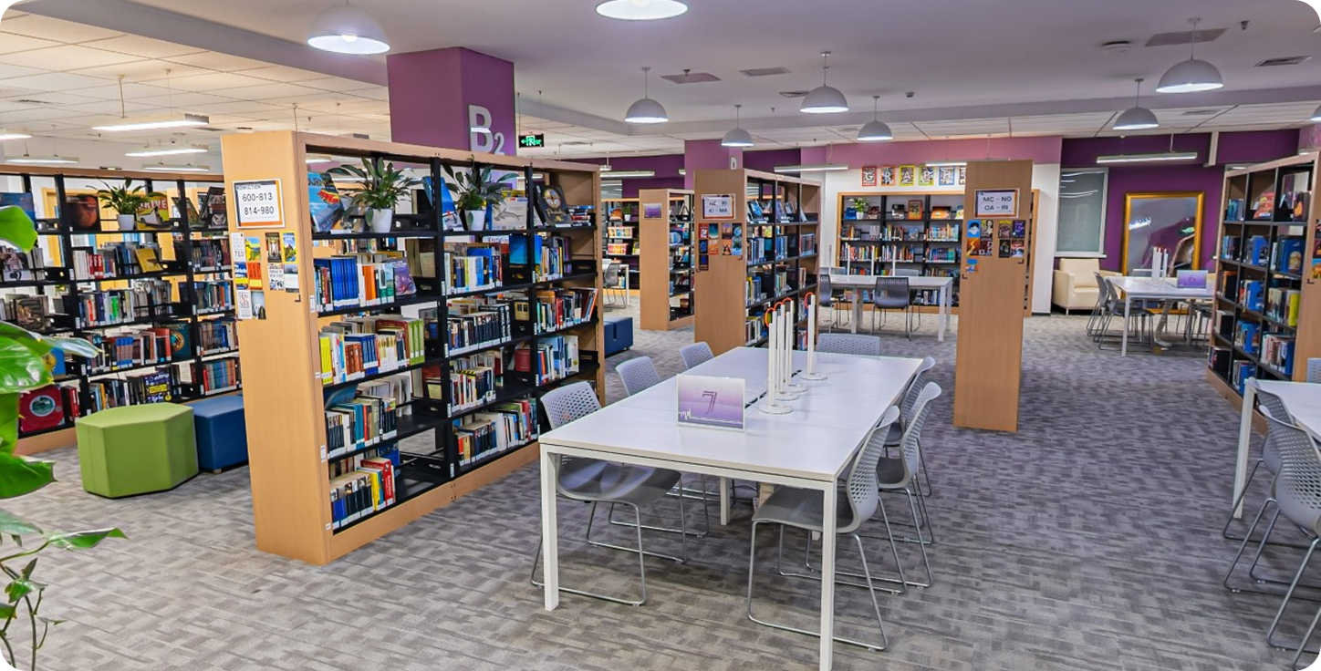 清香 Book Oasis 图书馆不仅是一座书籍的宝库,更是一个融合现代设计与文化氛围的阅读空间,服务于校内学生和周边社区居民。图书馆面积达1200平方米,藏书量超过10万册,可容纳400-500人阅读,并设有近200个座位,旨在为每一位访客提供舒适的阅读体验。图书馆分为多个功能区,包括英文青少年阅读区、中文阅读区、绘本区、电子阅览区、教师专属阅读空间以及学生读者俱乐部,满足各年龄段和兴趣的需求。馆内书架分类明确,标有“Young Adult Fiction”、“Non-fiction”及“Children’s Literature”等标签,大量采购的中英文原版图书,支持学生双语能力的提升。