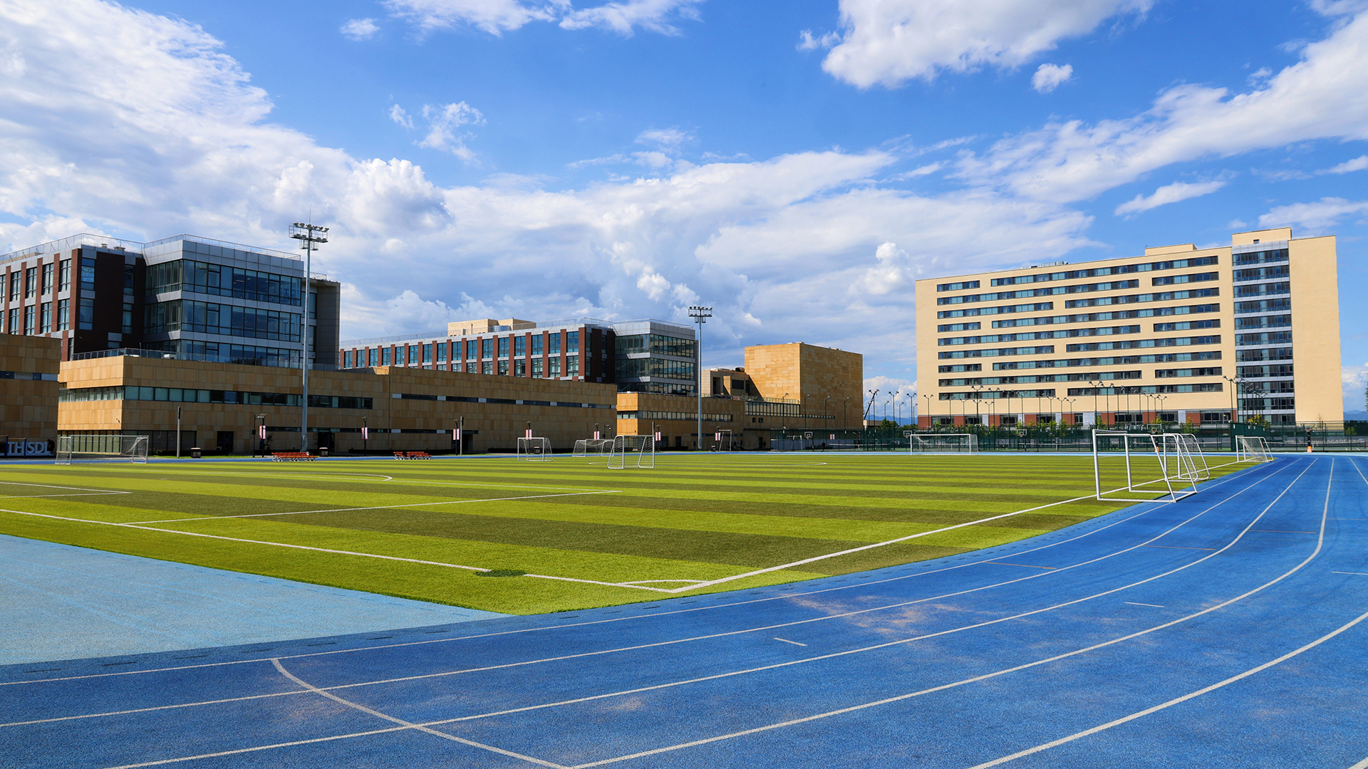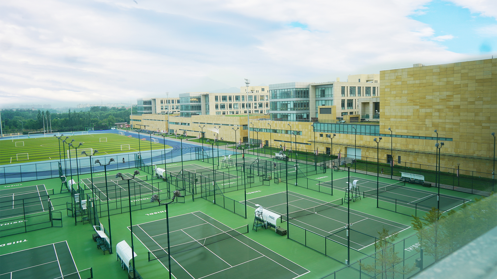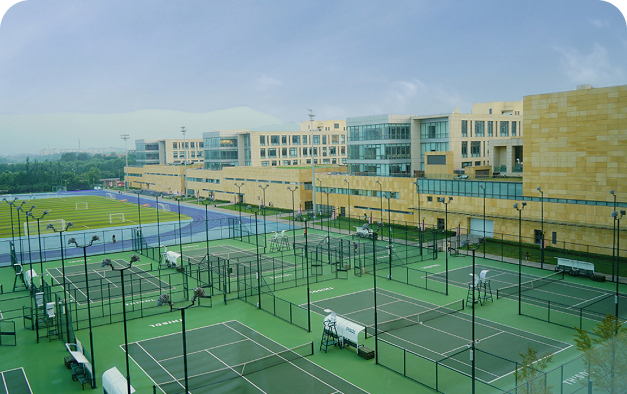 校园建筑面积 16.2 万平米。拥有 400 米跑道的操场、千人剧场、多功能厅、幼儿园、学生宿舍楼、教职工公寓楼和若干体育场馆 ( 含游泳馆、冲浪馆、篮球馆、足球场、羽毛球馆、击剑中心、兵乓球馆、网球场、室内高尔夫球场、蹦床馆、健身房、动感单车教室等 )。